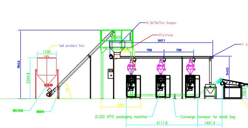 1, ថង់ Samll បង្កើតម៉ាស៊ីនវេចខ្ចប់បំពេញ .ផ្នែកនេះរួមបញ្ចូលទាំង hopper វត្ថុធាតុដើម, ម៉ាស៊ីនផ្តល់អាហារដល់វីស incline .Middle buffer hopper, and horizonly feeding screw for sending the raw material to 6 sets Auger measruing machine